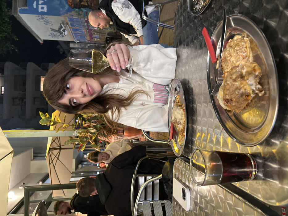 A woman holds a glass of white wine at an outdoor table with a metal surface. Plates of food sit nearby, one with a large portion of a dish covered in a creamy sauce. A red utensil lies next to the food. A dark liquid in a glass and a white smartphone are also on the table. Other people are in the background, and there is a building and trees behind the woman.