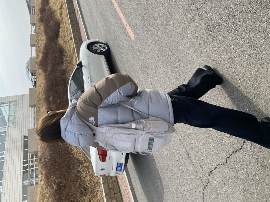 An individual is depicted mid-stride, walking away from the camera on an asphalt road in Zhongtun, China. The person, viewed from behind and slightly to the right, wears a two-tone puffer jacket (light blue/grey and brown, featuring a "The North Face" logo on the left shoulder), black pants, and black shoes. A light grey backpack with "SKECHERS" branding is carried, with a clear water bottle housed in a pink-eared mesh holder in its side pocket. To the left, a white Volkswagen sedan with a partially visible license plate ("DG 65399") is parked. The background features a sloped embankment covered in dry, brown vegetation, topped by a light-colored building with multiple windows. A faded orange line is visible on the asphalt road's right side. The scene is illuminated by bright, diffused daylight under an overcast or hazy sky.