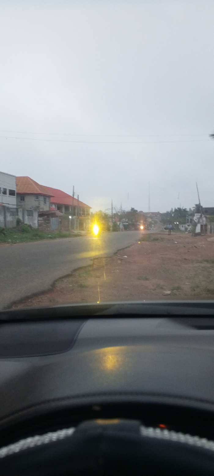 The image captures a street scene in Akure, Nigeria, viewed from inside a vehicle. The foreground features the dark grey dashboard and the upper section of a steering wheel, indicating the observer's position. A paved, two-lane road, appearing dark grey, recedes into the distance, gently curving left. Adjacent to the road, a reddish-brown dirt shoulder runs along the right side. On the left side of the road, multiple multi-story buildings with reddish-orange tiled roofs and light-colored facades are visible, some partially obscured by fencing or other structures. A very bright, intense yellow light source, consistent with a vehicle's headlight or a streetlamp, is prominent on the left side of the road, casting a discernible vertical light streak on the viewing surface. Further down the road, to the right of the center, a dimmer orange light source is present. Several indistinct human figures are visible on the far right side of the road, near the dirt shoulder, appearing to be pedestrians. The sky is uniformly overcast and light grey, suggesting either dawn, dusk, or heavily clouded daytime conditions. Overhead power lines or utility cables are faintly discernible against the sky. The environment appears to be a semi-urban thoroughfare.
