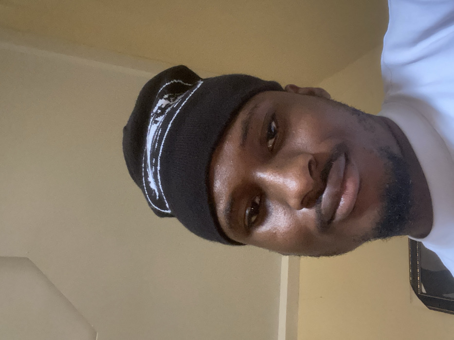 This image presents a close-up indoor portrait of an adult male. The subject has dark skin, a short beard on his chin and jawline, and is wearing a black knit beanie with a white horizontal graphic design on the front. He is also wearing a white short-sleeved shirt, partially visible. The individual is looking directly at the camera with a subtle smirk. The background features a plain, light beige-colored wall and ceiling, with a dark, framed object partially visible in the lower-left portion of the frame. The lighting appears to be artificial and originates from above. The specific location within Makurdi, Nigeria, is not discernible from the visual evidence provided.