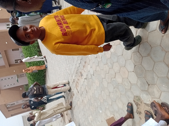 The image displays an outdoor scene in the city of Kwazailewa, Nigeria, featuring multiple individuals on a paved surface with a building and vegetation in the background