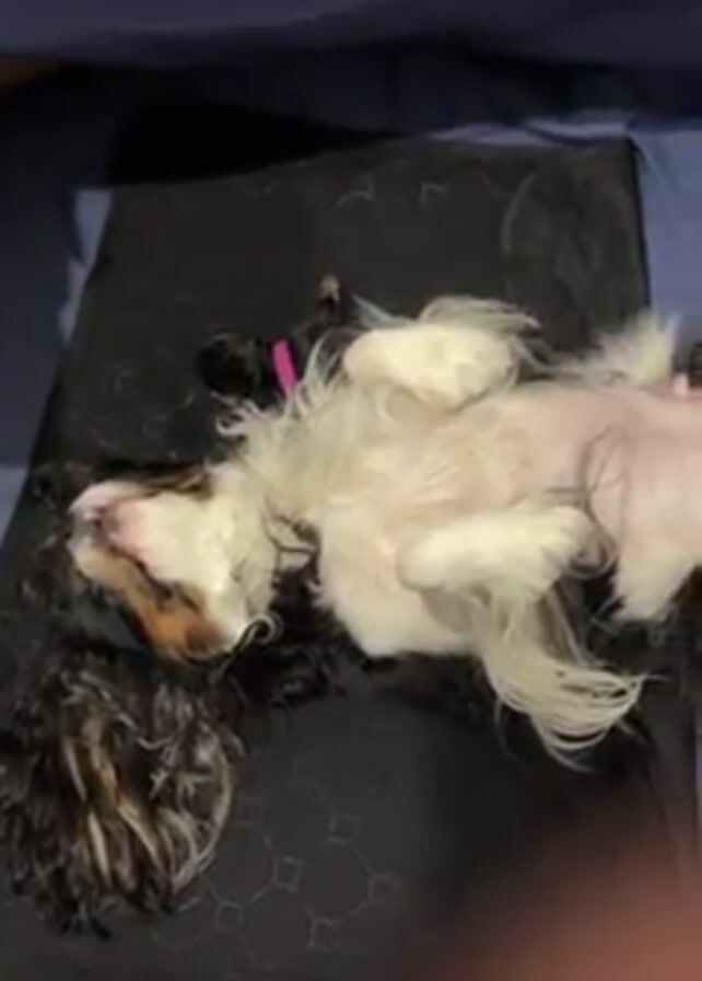 A small, tricolor Cavalier King Charles Spaniel dog is lying on its back on a dark blue mattress, with its belly exposed. The dog is mostly white on the belly, with black and tan markings on its head and back. Its fur is long and wavy. A hand reaches in and gently rubs the dog's belly. A small, black and white puppy with a blue collar is lying on the dog's belly, near the dog's teats. The dog appears relaxed and may be sleeping. A cardboard box is partially visible in the upper left corner. The scene appears to be indoors, possibly on a bed.
