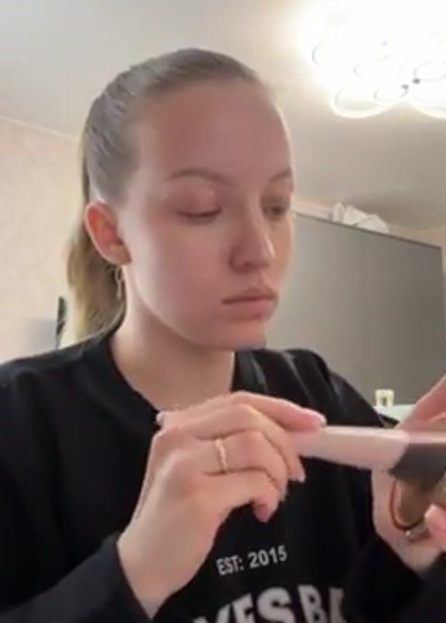 A young woman with blonde hair pulled back in a ponytail is applying makeup in a well-lit room