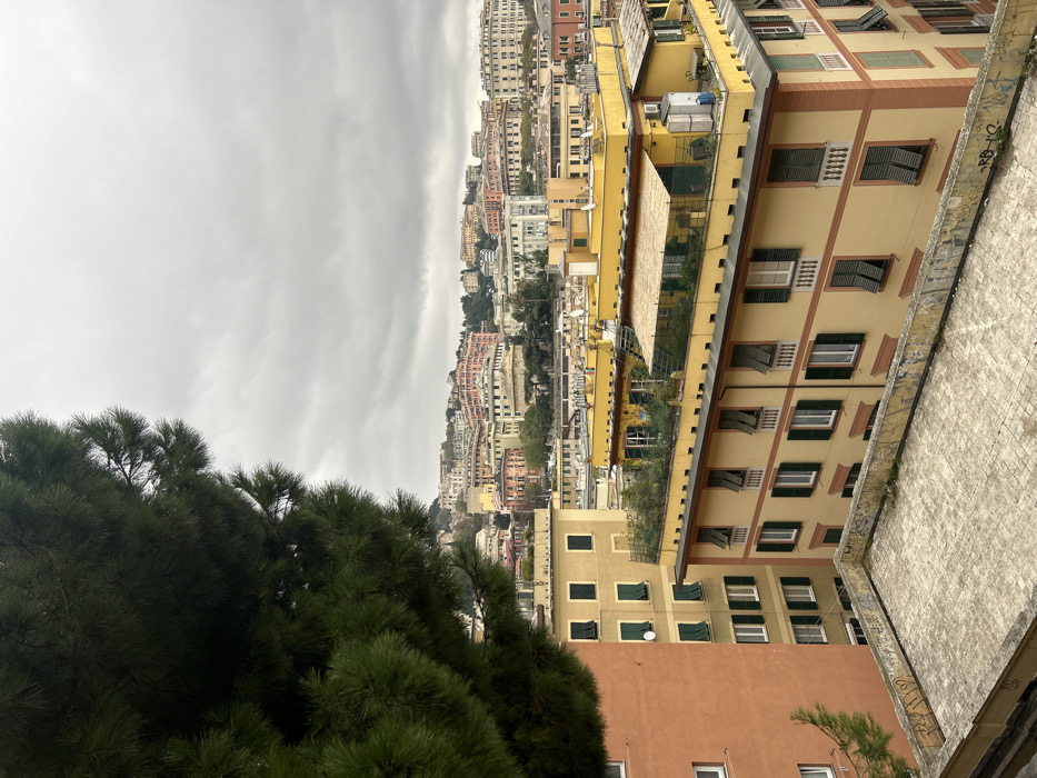 The image depicts a panoramic view of Genoa, Italy, under an overcast sky. In the immediate foreground, a dense, dark green coniferous tree occupies the upper left quadrant, partially obscuring the view. Below this, a flat, light grey concrete or tiled rooftop terrace with a low perimeter wall, marked with graffiti-like scrawls, extends across the lower portion of the frame. In the midground, several multi-story residential buildings are visible. To the left, a terracotta-orange building features multiple windows with white frames and dark green shutters, some partially open. Adjacent to it and towards the center, a prominent light yellow building with terracotta-orange trim at its corners and around windows displays numerous white-framed windows with dark green shutters, many set ajar. Its rooftop features a verdant area, a retractable brown awning, and several objects including a white external air conditioning unit and what appears to be outdoor seating. The background consists of a dense urban landscape extending up a series of hills. Numerous buildings, characterized by varied pastel facades including pinks, yellows, whites, and light greys, are tightly packed, showcasing typical Mediterranean architectural styles. No individuals or specific activities are discernible within the frame. The overall environment is an urban setting on a cloudy day.
