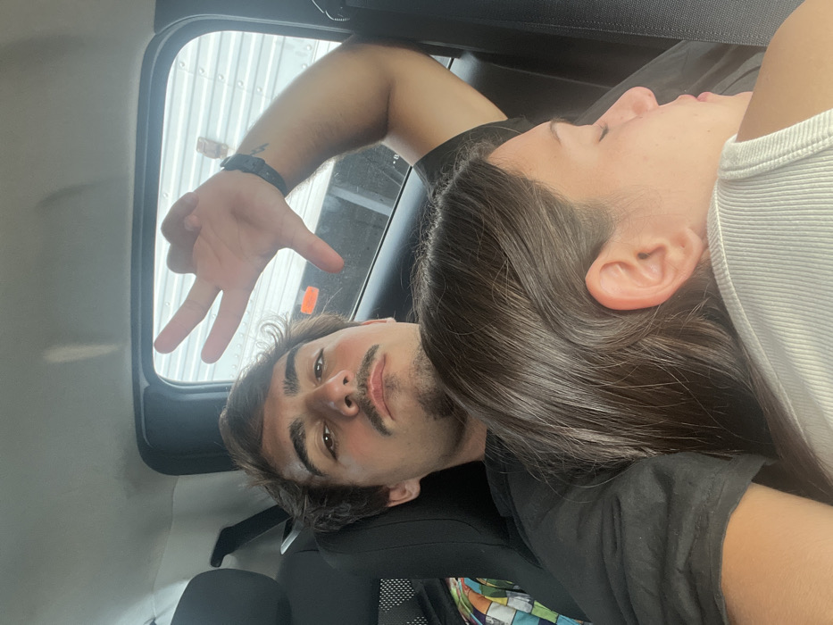 This image depicts two individuals inside a vehicle in Ilhabela, Brazil. A male subject is positioned in the foreground, facing the camera with a neutral expression. He has medium-brown, wavy hair, a mustache, and a goatee, wearing a dark t-shirt. His left arm is raised, with his hand forming a three-finger gesture. A dark watch is visible on his left wrist, and a faint tattoo on his forearm. A female subject is seen in profile, resting her head on the male subject's left shoulder, with her eyes closed. She has long, dark brown hair and is wearing a light-colored, ribbed tank top. The vehicle's interior features dark upholstery. Through the window, a light-colored, corrugated metal surface, likely from a large truck or trailer, is visible in the background, along with a small orange reflector.