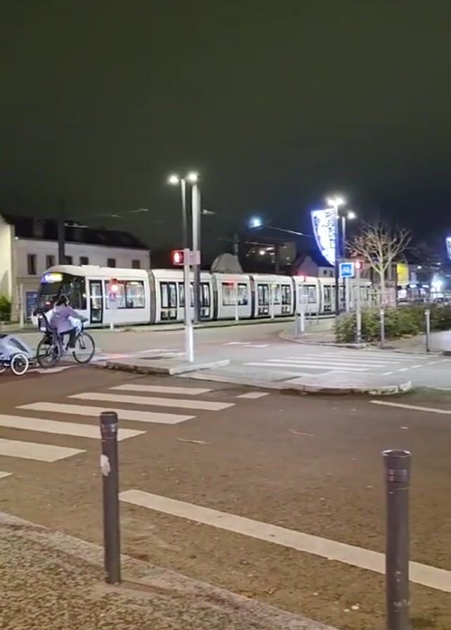 At night, a white tram passes on the street. A person on a bicycle with a trailer pulls across the crosswalk in front of the tram as it clears the intersection. The intersection is at the edge of a town square with streetlamps. The traffic lights at the intersection are red. The sky is dark.