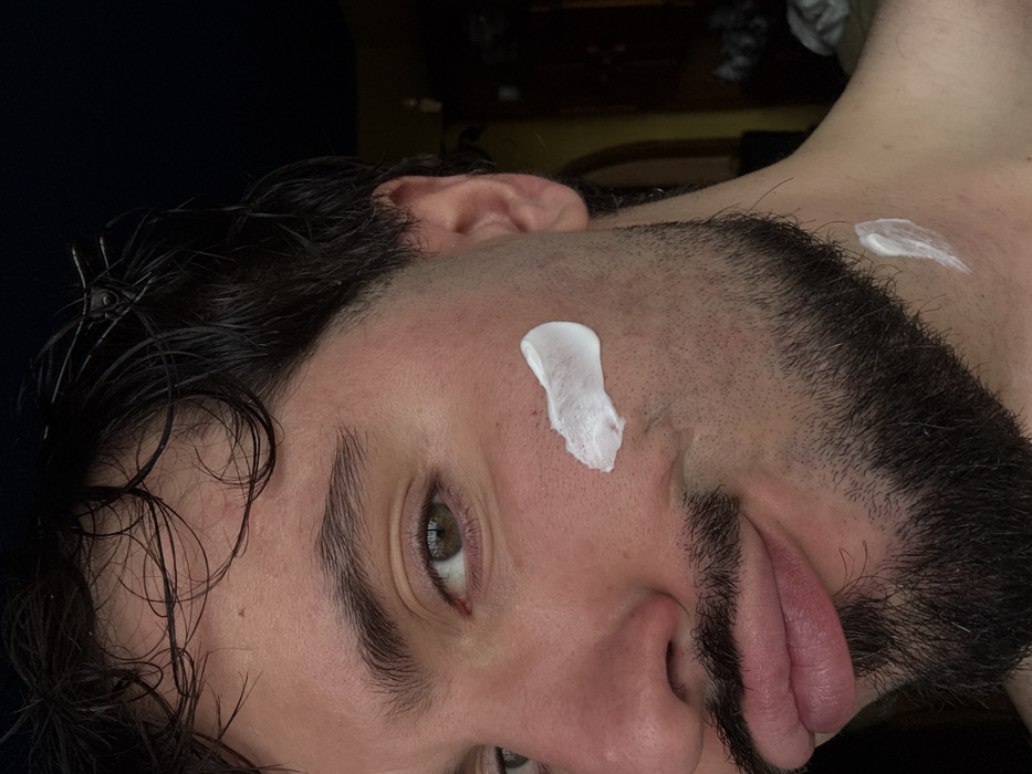 A close-up photographic record captures a male subject indoors, within the city of Vila Nova de Gaia, Portugal, though the specific location inside the city is unidentifiable. The subject presents with a light to medium skin tone, dark wet curly hair, and a dark, trimmed beard and mustache. A dark hair clip is visible within the wet hair on the right side of the head, above the ear. His eyes, appearing hazel or greenish-brown, are directed forward towards the viewer. The lips are full and slightly pursed. Three distinct applications of a white, viscous substance, consistent with cream or lotion, are present on the skin: one elongated streak on the right cheek, inferior to the eye; one smaller streak superior to the right eyebrow; and one smaller streak on the right side of the neck, inferior to the jawline. The background is dark and indistinct.