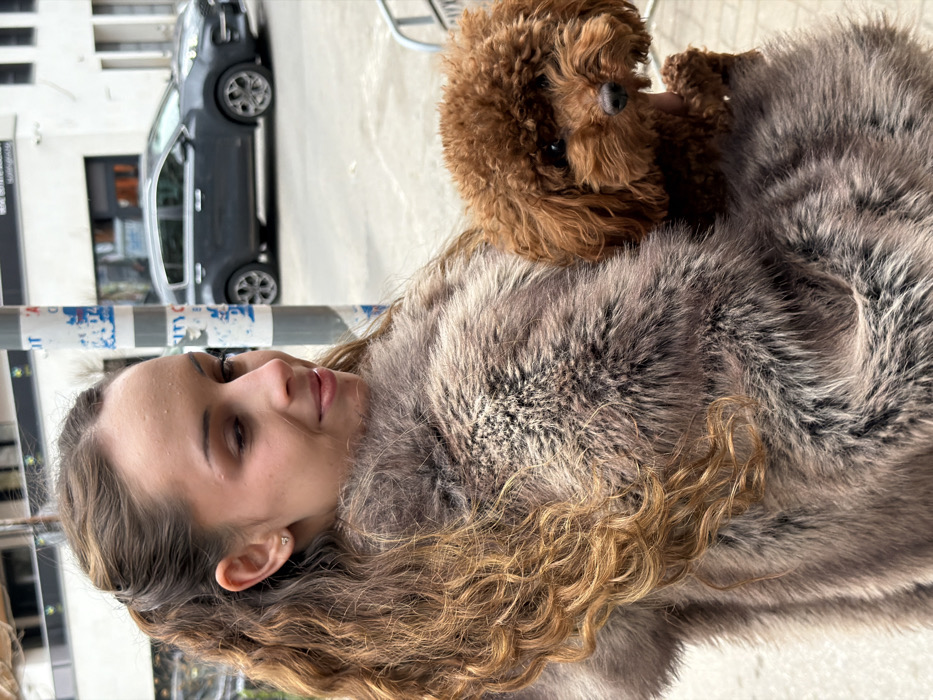 A young adult female, depicted from mid-torso up, stands outdoors on a paved surface in Sofia, Bulgaria. She has long, wavy, light brown hair, partially pulled back, with the remainder cascading over her left shoulder and back. She wears a multi-toned grey and brown faux fur coat with a shaggy texture. Her left earlobe displays a small stud earring. She looks downwards and to her right (viewer's left) with a slight smile. In her arms, she cradles a small, reddish-brown, curly-haired dog, which faces directly towards the viewer with dark eyes and nose. The background features a vertical metal pole with remnants of faded blue and white stickers/posters. Behind the pole and the subject, a dark grey Kia Sportage SUV is visible on a street. Further back, multi-story buildings line the street; one features dark windows and a partially obscured sign, while another is lighter in color. A metal barrier is partially visible in the lower right of the frame. The ground beneath the subjects is a light grey paved surface.