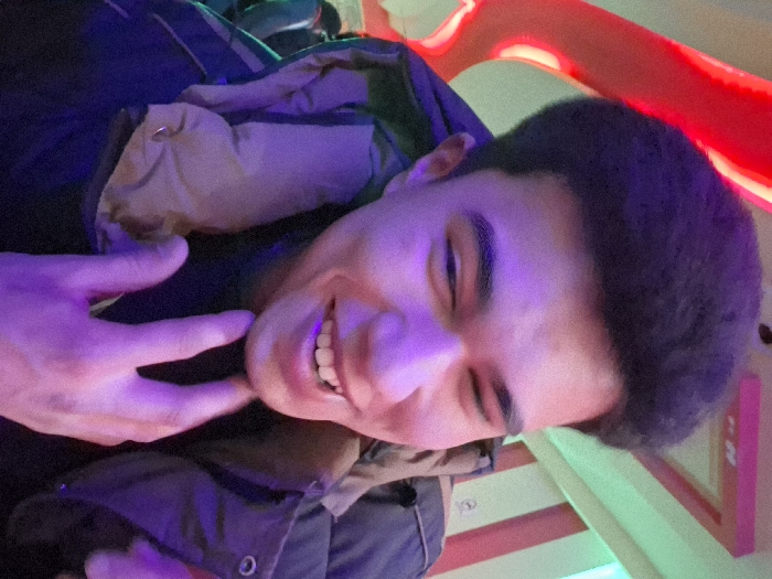 The image depicts an indoor scene in Takhtakuprik, Uzbekistan, focusing on a young adult male. His face, illuminated with a prominent purple hue, is captured in a close-up. He has dark, voluminous hair and a smiling expression, revealing his upper teeth, with his right eye (viewer's left) partially closed. He is wearing a dark, possibly padded jacket, with a visible light tan inner lining around the collar. His left hand, fingers splayed, is positioned near his chin and neck. The background is blurred, displaying abstract forms and streaks of red and green light, consistent with an entertainment venue featuring artificial colored illumination.
