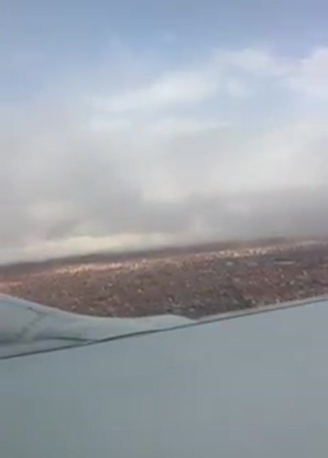 From the perspective of an airplane window, the video shows a city obscured by heavy clouds