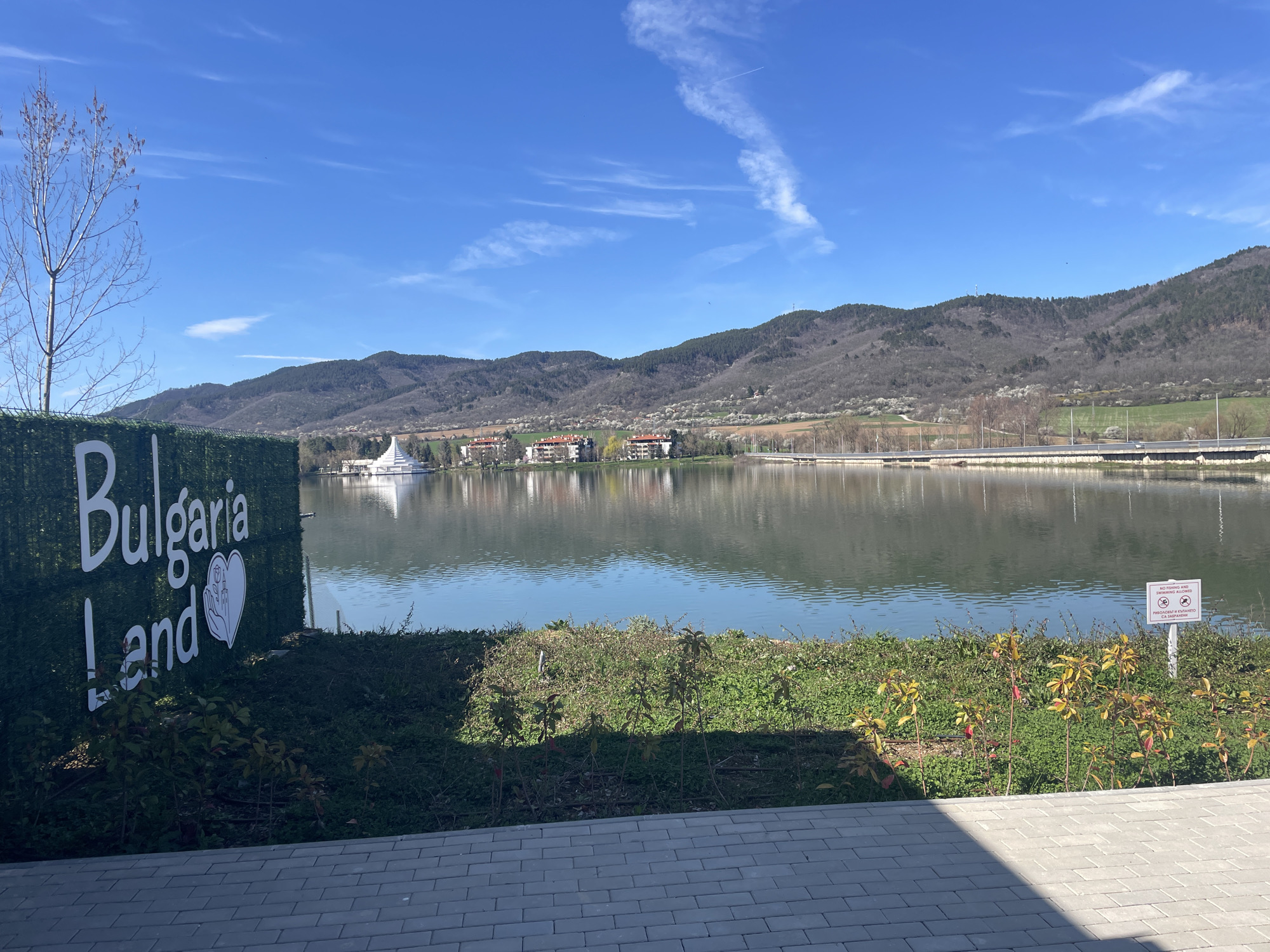view of Lake Pravets in Pravets, Bulgaria, on a clear day. In the foreground is a sign that reads "Bulgaria Land." Beyond the sign, the lake reflects buildings and tree-covered hills. A small white structure with a pyramid-like roof is visible on the lake's edge. A bridge spans part of the lake on the right side of the frame. A sign indicating "No Fishing and Swimming Allowed" is also visible near the lake's edge. The foreground includes paving stones and vegetation. The sky is blue with wispy clouds.