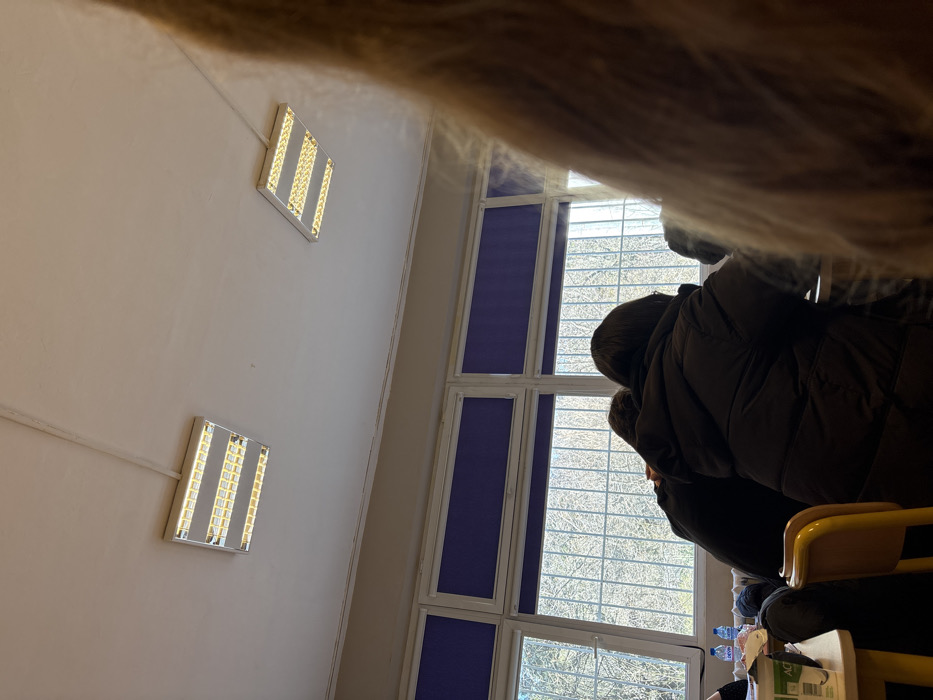 The image depicts an indoor scene, likely a classroom or educational facility, viewed from a seated perspective