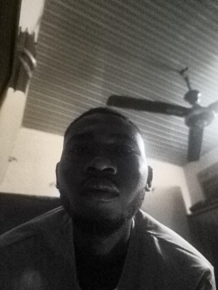 A dimly lit, low-angle indoor photograph captures an unidentified adult male subject, positioned centrally in the foreground. His face is largely obscured by shadow, revealing only faint outlines of facial features and a visible beard or stubble. He wears a light-colored t-shirt. The background consists of a corrugated metal ceiling with distinct parallel lines, and a dark-colored, stationary ceiling fan with visible blades mounted to the right of the subject. Light-colored walls are visible on both sides of the subject, suggesting an enclosed interior space. The scene is located in Unguwar Gabas, Nigeria.