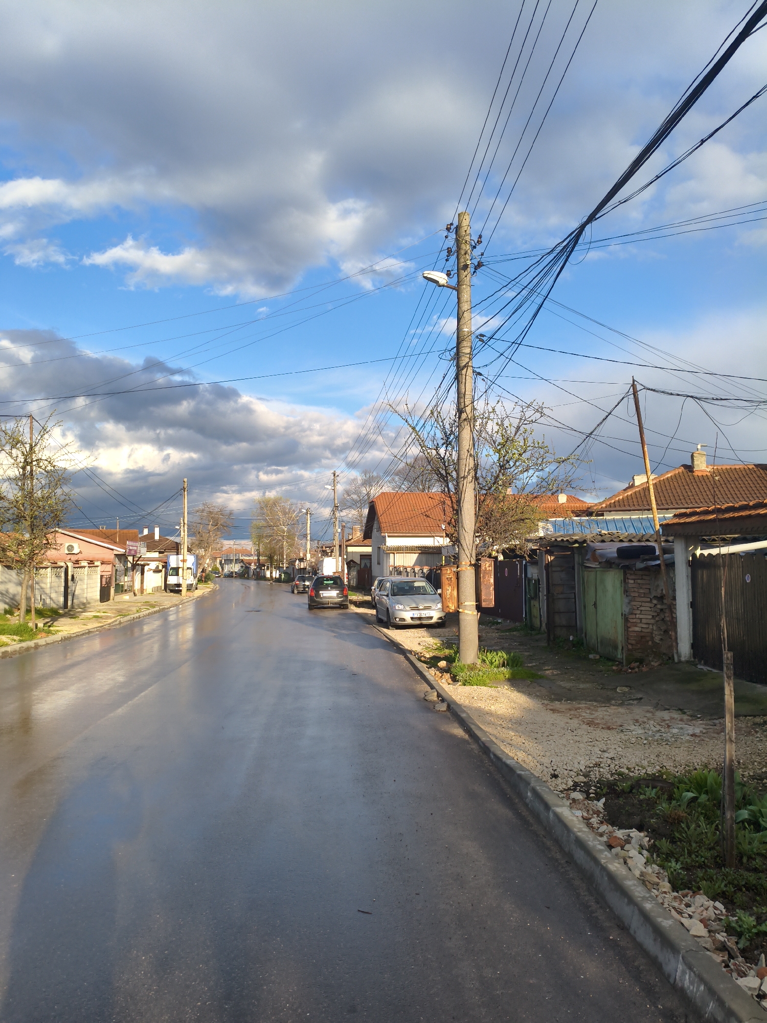 The image depicts a street in Dobrich, Bulgaria, on a cloudy day after a rain. The street is asphalt and wet, reflecting the sky. On either side of the street are residential buildings with red tile roofs and various fences. Several parked cars are visible along the right side of the street. Utility poles with numerous wires are present, running along the length of the street. Sidewalks are partially gravel and have some vegetation growth. The sky is filled with a mix of blue and grey clouds.