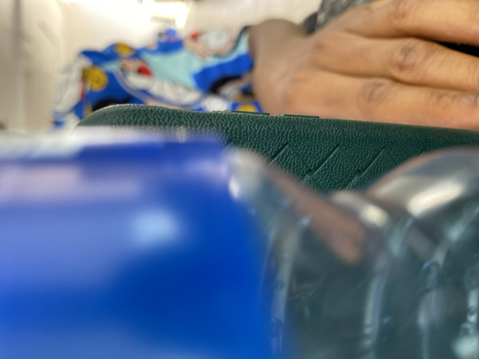 The scene is a close-up, interior shot with a shallow depth of field. A dark green, textured object with a prominent diagonal woven pattern, possibly a smartphone case, occupies the central and right foreground, appearing slightly angled. To its left, a transparent plastic bottle containing clear liquid is visible, reflecting a strong blue light from an unknown source and is largely out of focus. To the immediate right of the green object, a human hand with dark skin is partially visible, its fingers extended or resting, appearing to interact with or be near the green object. The background is heavily blurred, revealing a patterned fabric, primarily blue with yellow, red, and white elements, exhibiting shapes resembling cartoon characters, specifically Mickey Mouse ears. Beyond this, indistinct light-colored shapes suggest an indoor environment. There are no discernible visual identifiers within the image to specify a location in the city of Jos, Nigeria.