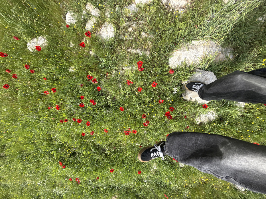 A high-angle, overhead view captures the lower body of an individual standing in a vibrant green field within Modiin-Maccabim-Reut, Israel. The ground is densely covered with green grass, punctuated by numerous scattered red flowers, smaller yellow flowers, and occasional white flowers. Several light-colored, irregularly shaped rocks are embedded in the terrain, particularly on the right side of the frame and beneath the subject's right foot. The individual wears dark, faded wide-leg jeans and black canvas sneakers featuring white laces and tan rubber soles. The left foot is positioned on the grassy ground, while the right foot rests upon a rock.