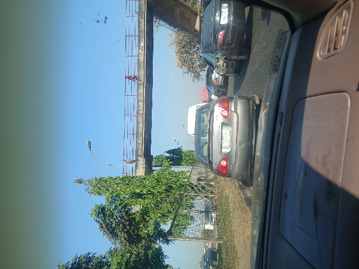 A street scene is captured from inside a car, showing traffic congestion. A gray sedan with visible license plate is closely followed. A pedestrian bridge spans the road. Trees and vegetation line the road. The sky is clear. A lamppost and pedestrian access ladder are visible near the bridge. Part of the car interior is visible on the right.