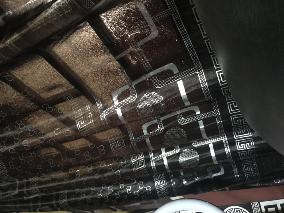 This image displays a close-up, angled view of a dark brown fabric, consistent with a curtain or upholstery material, located indoors in Oba-Ile, Nigeria