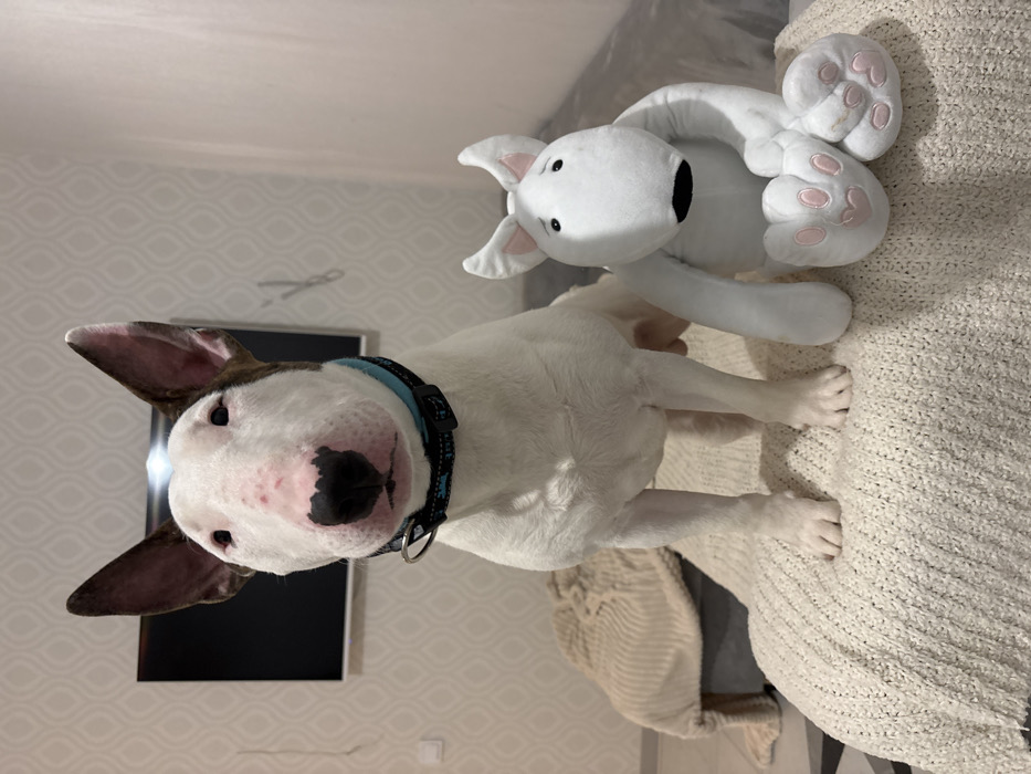 - "A bull terrier stands facing the viewer, wearing a blue and black patterned collar" by FM-4zhu12, licensed under CC BY 4.0