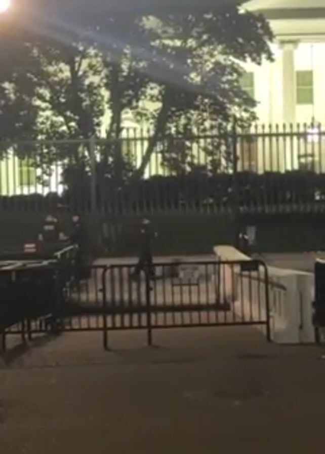 White House at night, illuminated by light fixtures. A metal fence separates the viewer from the White House grounds. In front of the fence are metal barriers and white rectangular objects. Three individuals in dark clothing, possibly security personnel, are positioned on the other side of the barriers, near the fence. One of them appears to be walking. The scene is captured with a slight camera shake. The person filming says “Man arrested at White House for crossing the barricade.”