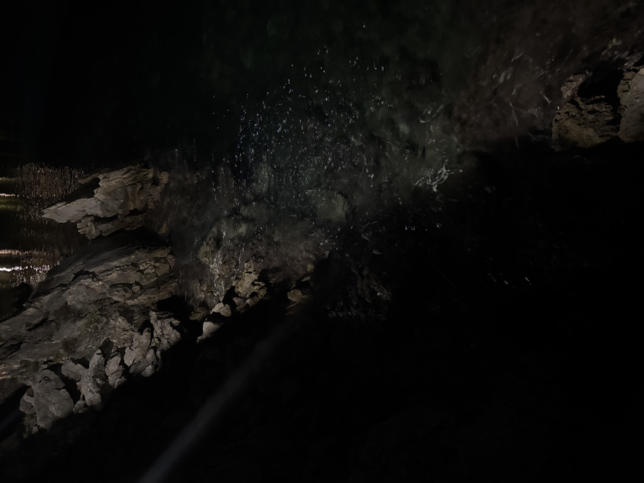 The image depicts a nighttime scene of a rocky coastline alongside a body of water in Budva, Montenegro. A steep, irregular rock formation, primarily dark grey and brown, extends from the upper left downwards to the center. This rock face is partially illuminated by an external light source, highlighting its texture and a collection of smaller rocks at its base, where it meets the water. The water occupies the right portion of the frame, appearing dark with areas of semi-transparency near the rocks, revealing the underwater seafloor. The water's surface exhibits ripples, small patches of white foam, and numerous tiny reflective points, possibly from surface disturbances or small marine life. In the upper right, the water reflects blurred, yellowish light sources from a distant, unseen urban area. A prominent dark, diagonal band obscures the far-left foreground. No individuals or direct human activity are visible.