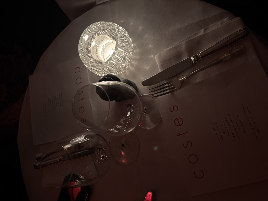 A dimly lit, intimate restaurant table setting features two wine glasses, one overturned, alongside a textured candle holder. Silverware is neatly arranged on a napkin, placed over a menu card that reads "costes" vertically. The menu lists various cocktails and liquor, including "MARTINI COCKTAR," "GIN BASIS SMASH," "BELUGA MULE," and "SPICY MARGARITA," with associated prices. The focus is on a refined, atmospheric dining experience.