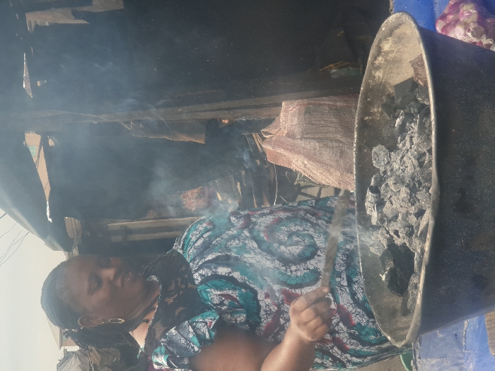 The image portrays an adult female tending a charcoal burner in Nkpor, Nigeria
