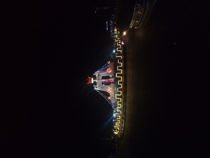 A building or structure, likely a house or church, is decorated with festive lights at night. The decorations include stars and other colorful lighting patterns, accentuating the building's architecture. Along what appears to be a pathway or border near the building, a zigzag pattern of lights provides further illumination, creating a whimsical and festive ambiance in the darkness.