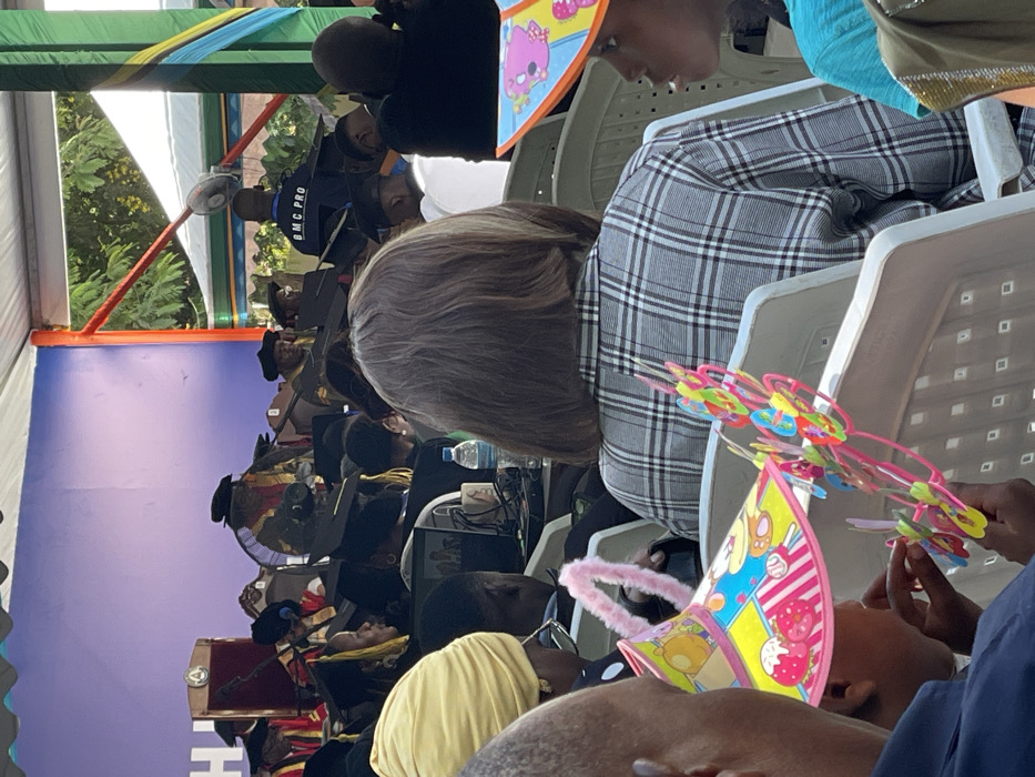 An outdoor graduation ceremony features attendees in black graduation gowns and mortarboards under a tent. Some individuals in the audience are visible. A woman with short brown hair wearing a grey and white plaid jacket sits in the foreground. A child with toys, including a party hat and a toy windmill, occupies the foreground. A bottle of water sits on a table. "BMC PRO" is visible on the jacket of one person.