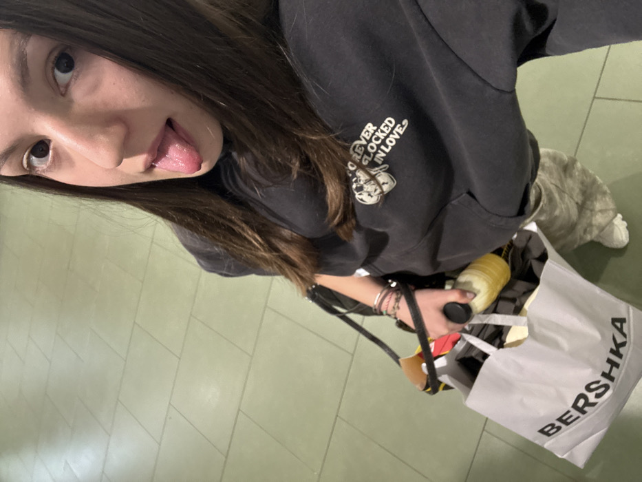 The scene depicts an indoor environment, likely a commercial establishment such as a shopping mall in Sofia, Bulgaria. A young female is centrally positioned, angled slightly, and appears to be taking a self-portrait. She has long, dark brown hair and looks directly at the camera with her tongue extended. The subject is wearing a dark grey hooded sweatshirt with a graphic on the chest that features two intertwined head-like figures and the text "FOREVER LOCKED IN LOVE." Light-colored, possibly patterned, trousers and white sneakers are visible on her lower body. A dark strap from a crossbody bag is visible over her right shoulder. Multiple bracelets are worn on her left wrist. In her left hand, she holds a white shopping bag prominently displaying the brand name "BERSHKA" in black letters. The bag contains several items, including dark fabric. Adjacent to the shopping bag, also held in her left hand, is a clear plastic bottle with a black cap, containing a yellow liquid. The floor consists of large, light green rectangular tiles.