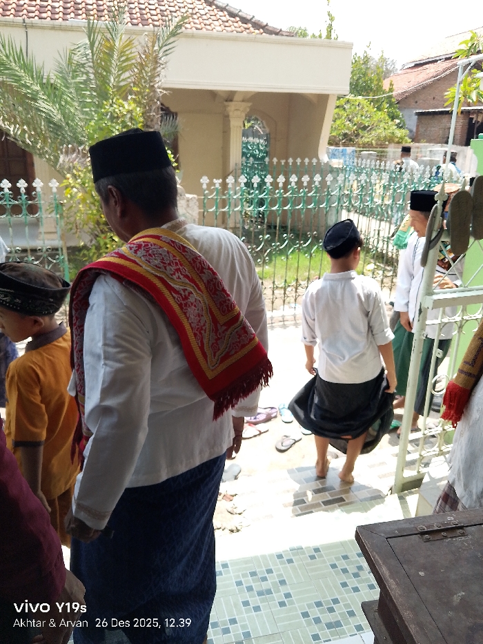 A group of Muslim men and boys are gathered, presumably for prayer. They wear traditional attire, including sarongs, white shirts, and peci hats. A man in the foreground has a red and gold shawl draped over his shoulder. Most have removed their shoes, leaving them scattered on the tiled ground. A fence and building can be seen in the background. A timestamp indicates the photo was taken on December 26, 2025.