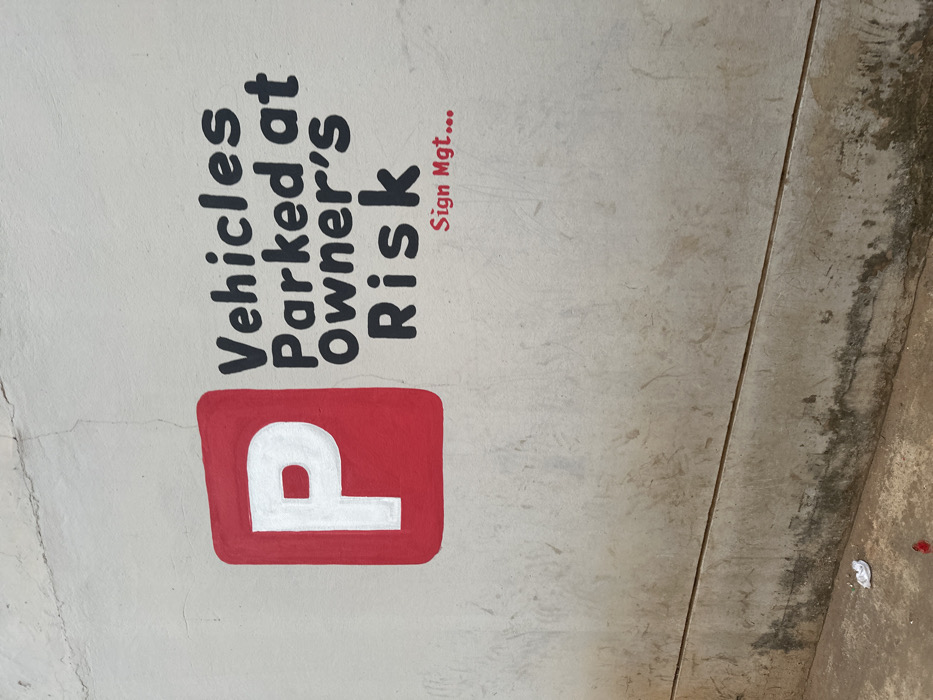 This image captures a weathered light grey wall in Maiburiji, Nigeria, bearing a painted warning sign. The sign, located in the upper portion of the wall, features a red square with rounded corners containing a bold white capital 'P'. To the right, prominent black block letters read "Vehicles Parked at Owner's Risk," with smaller red text stating "Sign Mgt..." positioned beneath it. The wall's surface exhibits fine vertical cracks in its upper sections and a distinct horizontal groove traversing its lower mid-section. The bottom third of the wall is discolored with dark, irregular staining, consistent with dirt and moisture. The ground directly beneath the wall is an uneven, light brown surface, showing scattered debris including a crumpled white item and a small red fragment. No individuals are present in the scene.