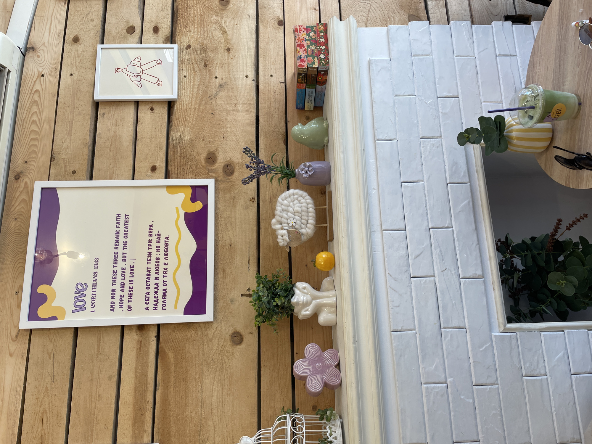 The image depicts a section of a wall in Burgas, Bulgaria, adorned with decorative elements. The wall appears to be constructed of vertical wooden planks. The decor includes two framed images, one featuring a red line drawing of a person and another displaying the word "love" alongside religious text in both English and Bulgarian. A narrow shelf attached to the wall holds several small objects, including books, a light green animal-shaped vase, a lavender plant, a knitted sheep figure, a yellow ball, and a white ceramic animal figure with greenery. Below, there is a lilac-colored flower and the top of a white decorative birdcage. Adjacent to the wooden wall is a white brick surface, likely part of an indoor structure. Resting on a table near the brick surface are a green beverage with a straw, a striped vase with green leaves, and a pair of sunglasses.