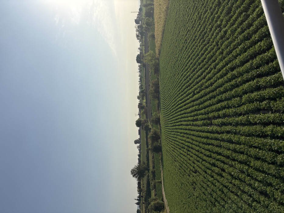 A vast field dominates the right side, showcasing rows of green crops stretching towards the horizon. To the left, a clear sky fills a significant portion of the image, transitioning to a lighter hue near the horizon. A narrow strip of land with trees and some vegetation runs between the field and the sky. The crops are arranged in neat lines.