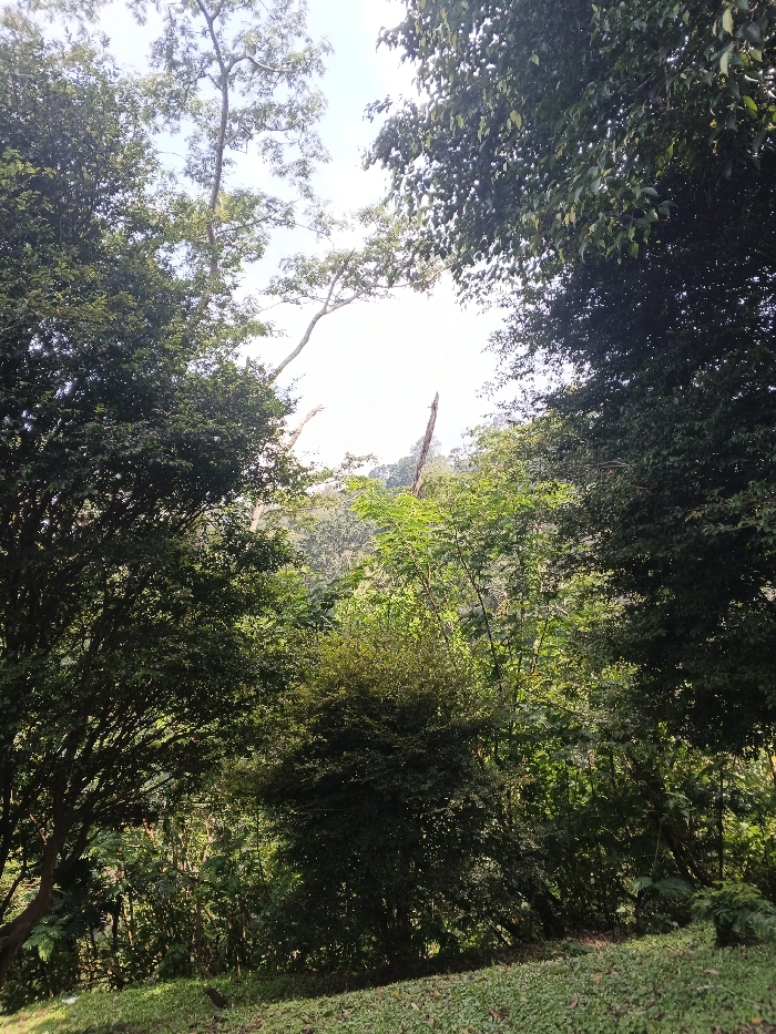 A dense forest scene is framed by verdant foliage in the foreground. Lush green trees with varying leaf textures occupy most of the image, partially obscuring a distant hillside. Gaps in the canopy reveal glimpses of a bright sky. Sunlight filters through the leaves, creating a dappled effect on the undergrowth. A bare tree trunk stands out among the greenery. The foreground features a patch of grass, providing a base for the scene.