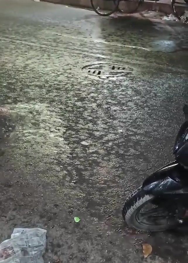 wet street scene, with a manhole cover and standing water. A black motorcycle is parked on the right. A bicycle-based cart is parked along the sidewalk. A man in a maroon robe rides a bicycle-based cart with green plastic sacks across the frame. Another man wearing a green shirt then rides a tricycle-based cart past. The carts are vividly painted with blue and red elements. Litter, including a newspaper, is visible on the ground.