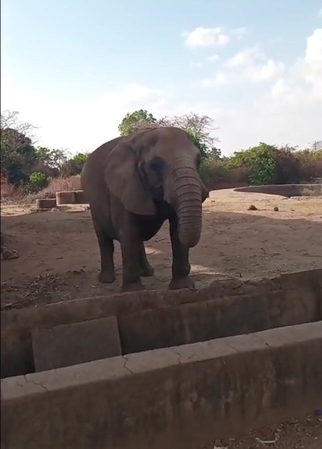n elephant in an enclosure at a zoo. The elephant is gray and has a long trunk. It is standing on dirt ground. There are concrete barriers in the foreground. In the background, there are trees and a blue sky with some clouds. People are talking in the background, but their speech is not clear. The elephant lowers its trunk to the ground and it appears to drink something from the concrete barrier.