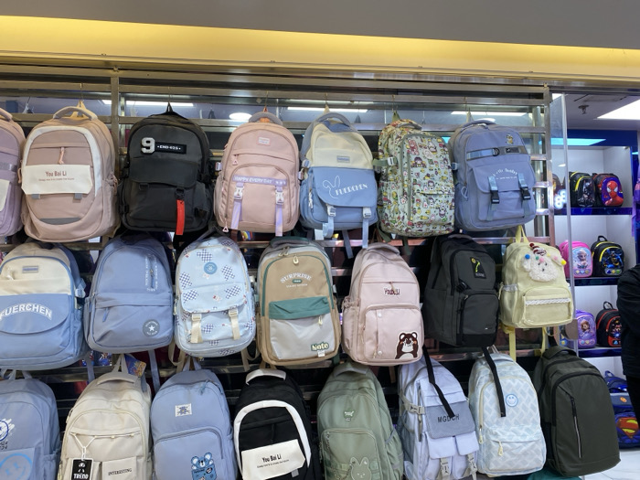 This image depicts an indoor retail environment, likely a market stall or shop, situated within a commercial area of Baiyun District, China. The primary subjects are a dense display of approximately 30-40 backpacks of various designs, colors, and sizes, all appearing new and available for sale. The backpacks are meticulously hung on individual hooks from multiple horizontal tiers of silver-colored metal display racks, spanning the full width of the frame. Colors range from pastel shades such as pink, light blue, cream, and pale green, to darker tones including grey and black. Many backpacks feature printed text, such as "You Bai Li," "HAPPY EVERY DAY," "FUERCHEN," "SURPRISE," "MGDCK," and a prominent "9" on a black backpack. Other designs include cartoon graphics, abstract patterns (e.g., light blue with white checks), and decorative elements like a fluffy white character attached to a cream-colored backpack. A black backpack features a distinctive red strap hanging from its front. Overhead artificial lighting, casting a warm glow, illuminates the top section of the display. In the background on the far right, another metal shelving unit is partially visible, holding additional smaller, character-themed backpacks, including those featuring Spider-Man, animated princesses, and a Superman logo. A partial view of an individual, dressed in dark attire, is visible at the bottom right corner of the frame, facing towards the displayed merchandise. No specific actions or interactions are discernible beyond their presence in the retail setting.