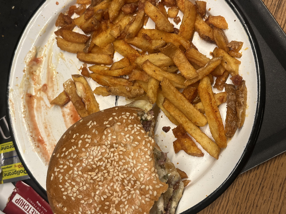 The image displays a partially consumed meal on a white plate with a black rim, situated on a dark surface that rests upon a wooden table. The primary subjects are a large, partially eaten burger and a serving of French fries. The burger, positioned on the left side of the plate, features a sesame seed bun, melted cheese, and visible meat patties; a bite has been taken from its left side. To the right and surrounding the burger are numerous golden-brown French fries, many appearing seasoned. Red sauce residue, consistent with ketchup, is smeared on the upper right portion of the plate. In the upper background, a red ketchup sachet labeled "KETCHUP" and "FABRIQUÉ EN FRANCE" is visible. Adjacent to it are two silver and blue sachets, one identifiable as "Doliprane paracétamol 1000 mg." No individuals or active interactions are depicted. This scene is located in Serris, France.