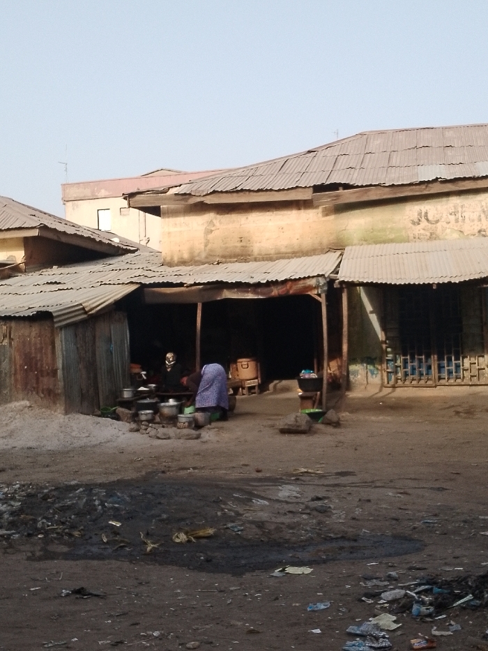 The image depicts an outdoor scene in Sabon Gari West, Nigeria, under clear, bright daytime conditions