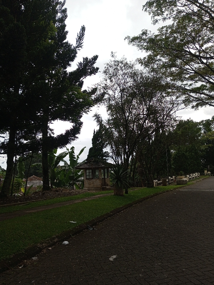 A quaint stone gazebo nestled among lush greenery stands beside a paved road. Tall pine trees dominate the left, while more expansive trees canopy the right. Banana trees cluster behind the gazebo, lending a tropical touch. A row of white stone benches lines the grass alongside the road. The overcast sky casts a muted light over the scene, highlighting the textures of the paving and foliage.