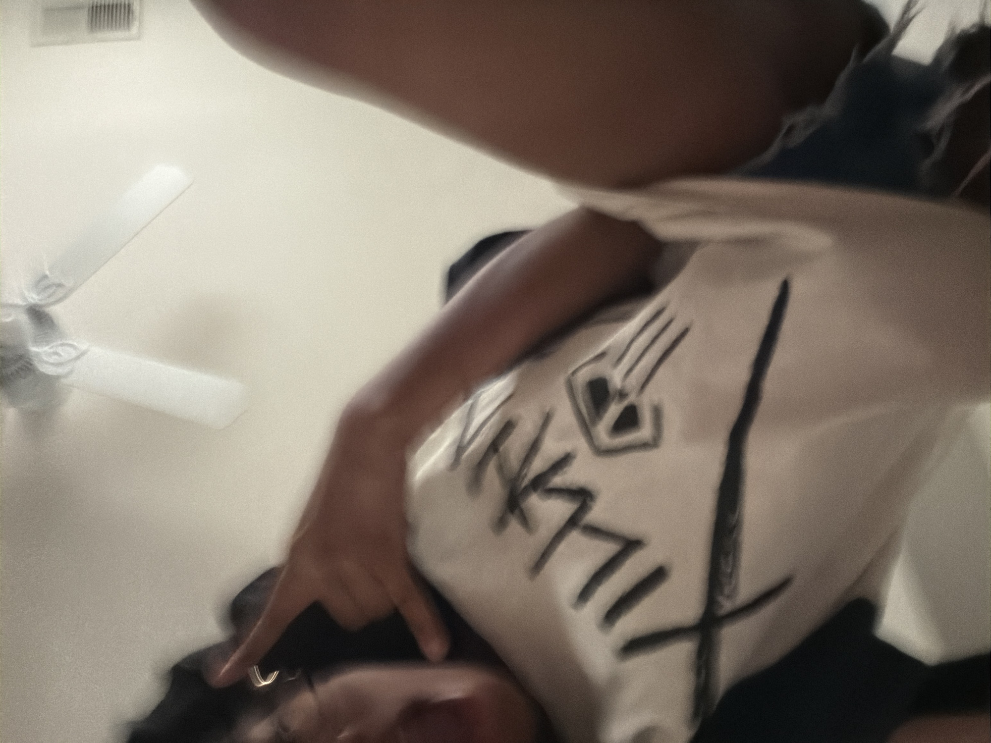 A blurry, close-up, angled shot features a person wearing a white t-shirt with bold black graphics. The design includes a stylized skull-like image and the text "NMIXX". The person's face is partially visible, with glasses and a gold ring. A hand with extended pointer finger is also visible. A ceiling fan is visible in the background with a vent near it.