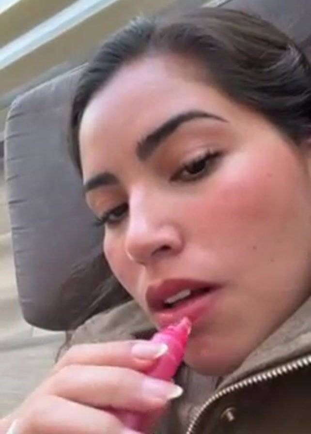 woman applying lip gloss to her lips with a pink applicator. She is lying down on a grey cushion. She is wearing a brown jacket and appears to have some makeup on, including blush. In the background, there are blinds on a window.