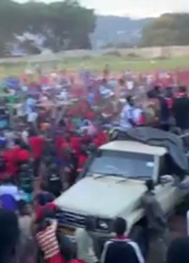 A large crowd of people surrounds a beige pickup truck in an open field. Many people are wearing red shirts and some are also wearing green shirts. Some people stand on the back of the pickup truck. Several people hold up flags. In the background, there are trees and a building to the left. There are mountains in the distance. The crowd appears to be excited and cheering. The scene appears to be a political rally or celebration.