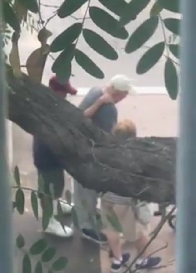 three individuals standing near a tree trunk on a sidewalk, as viewed through a partially obscured window or fence. One person is wearing a red cap and a dark blue t-shirt, another a white cap and a gray shirt, and the third, closest to the viewer, is wearing a striped shirt and tan shorts. The person in the red cap appears to be touching the shoulder of the person in the white cap. A stroller is partially visible in the background. The scene is framed by tree branches and leaves in the foreground.