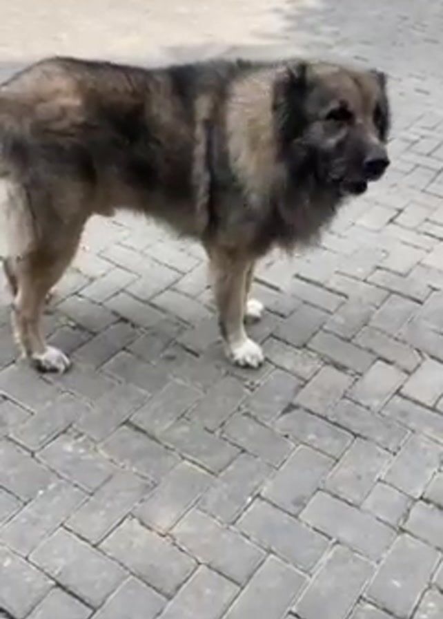 medium-sized dog with a long, thick coat of gray and brown fur standing on a paved brick surface