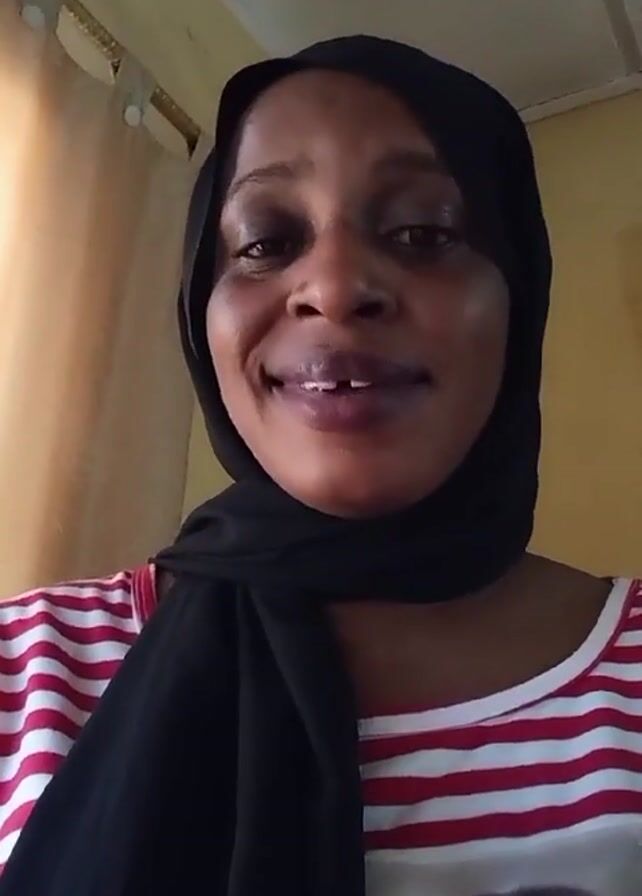 A woman is looking directly at the camera. She is wearing a black headscarf and a striped shirt. The shirt is white and red. There is a photo of a person on the shirt. The room is lit with natural light. There is a curtain behind her. The wall is yellow.