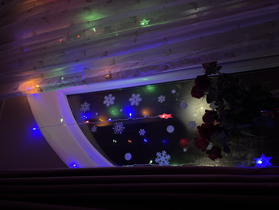 A window decorated with snowflake stickers and strung with multicolored Christmas lights is partially obscured by a vase of roses. Sheer curtains hang above the window, also illuminated by the festive lights. The scene is dimly lit, creating a cozy and slightly obscured ambiance. The presence of both Christmas decorations and flowers suggests a blend of holiday and domestic themes. The lower part of the image is obscured by what seems to be a bed or sofa.