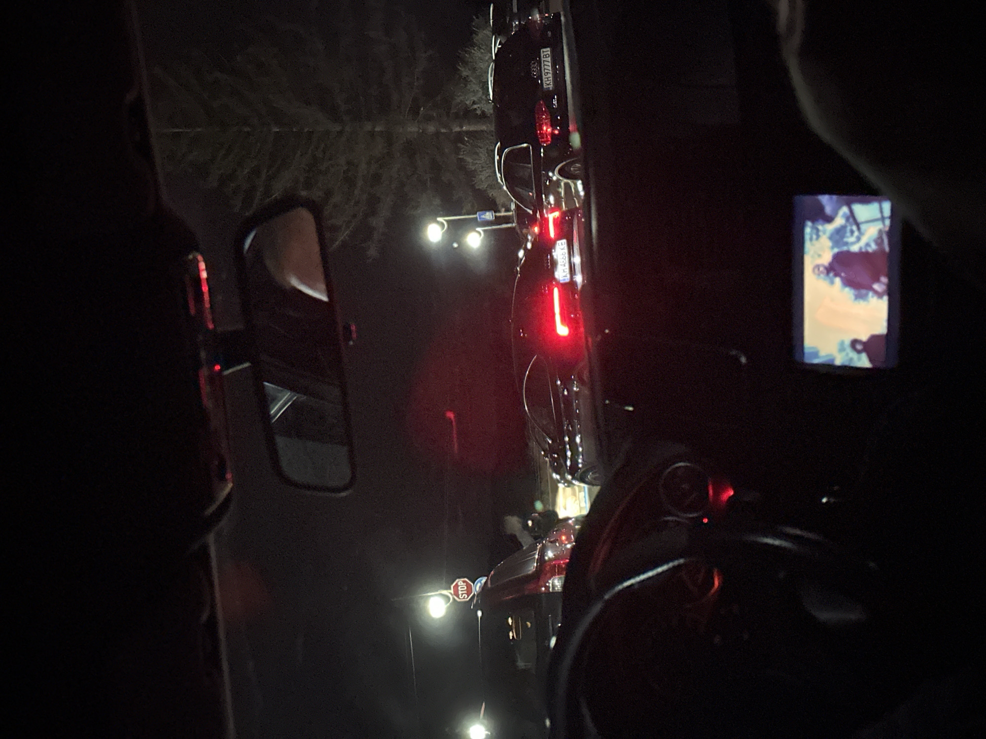 The image appears to have been taken at night from inside a vehicle, possibly a car. The vehicle is stopped in traffic, as evidenced by the red taillights of the car ahead and the presence of a stop sign reflected in the side mirror. A dashboard screen is visible, showing an indiscernible image. The general location seems to be a city street at night, with streetlights and trees visible in the background. The license plates on the car ahead read "KH 4666 KE" and "KH 9777 BT," indicating that it may be Bulgaria, but Dupnitsa cannot be verified. Further forensic details would require more specific information about the vehicle's location, direction, and surroundings.