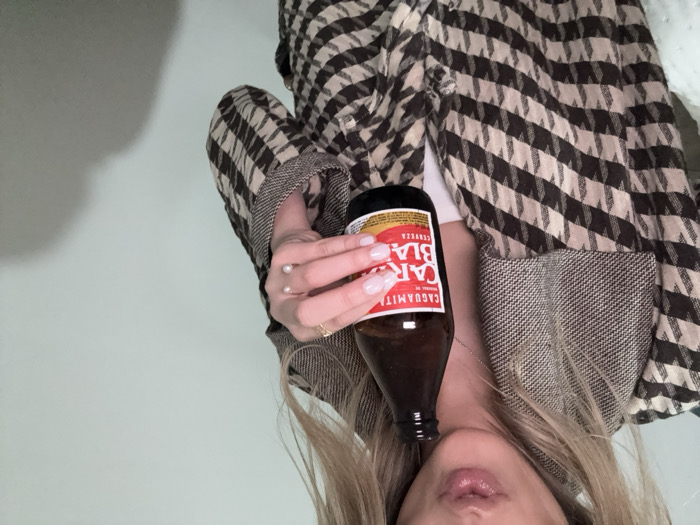 A person holds a dark brown beer bottle of “Caguamita Cara Blanca Cerveza” against their neck. The individual wears a houndstooth jacket, a white undershirt, and a delicate gold necklace. Fingers adorned with a pearl ring and a simple gold band are visible. The overall color palette consists of browns, whites, and muted pinks. The background appears to be a light, solid color, possibly a wall.